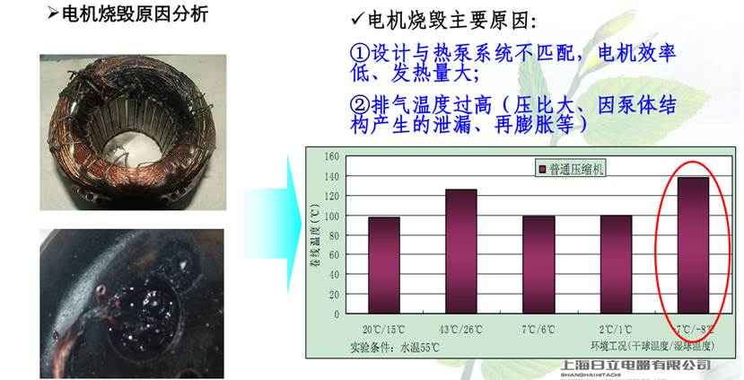 图七:热泵系统压缩机电机烧毁原因分析(摘自上海日立电器有限公司资料)